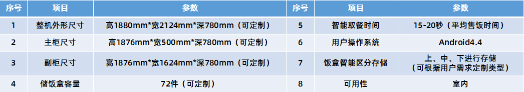“智能售餐機”是新一代機器人售餐終端,可售賣現煮面食、盒飯等快餐,恒溫保鮮,自助選餐,掃碼支付,快速出餐,語音提示,自動開關門,方便快捷,櫃内具備(bèi)消毒滅菌裝置,實現可控消毒滅菌,該智能售餐機爲用戶接受外賣提供便利的時間和地點(diǎn)。